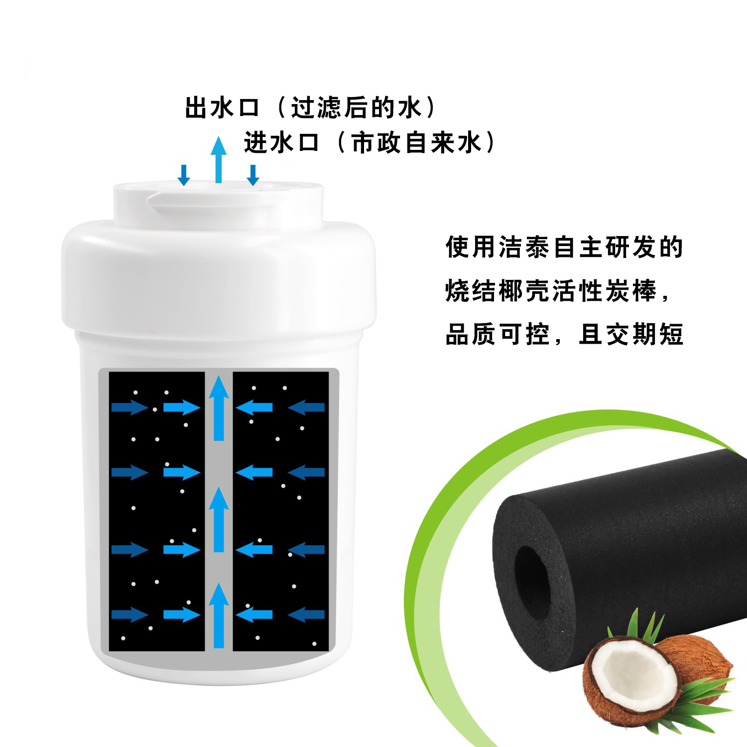 1. 由高质量椰壳活性炭棒和食品级PP外壳组成